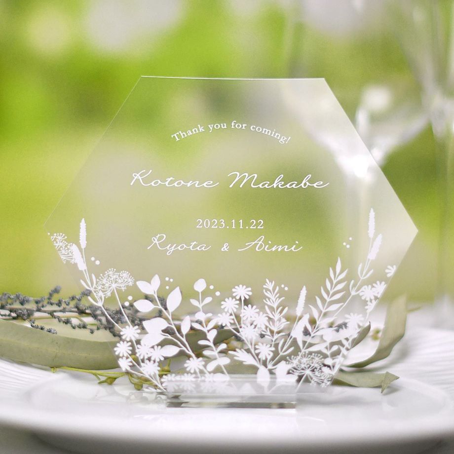 ゲストテーブルのアレンジと一緒に検討していただきたいアイテムが席札です。ゲストのお席をご案内するために活用する席札ですが、通常デザインではなく、工夫をプラスしたものを用意することもオススメです♪